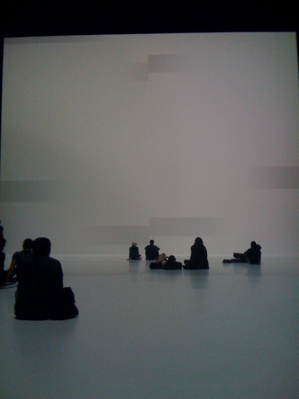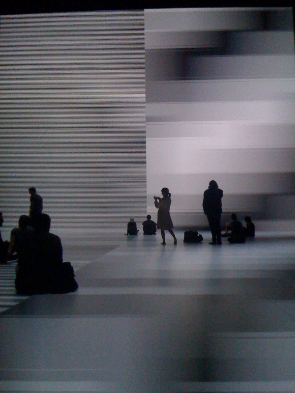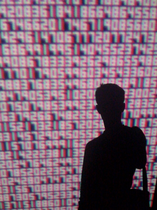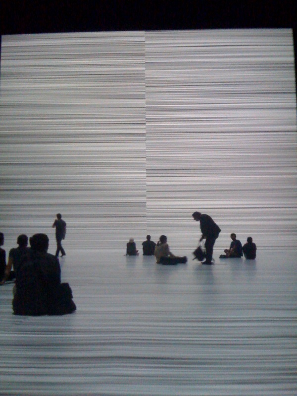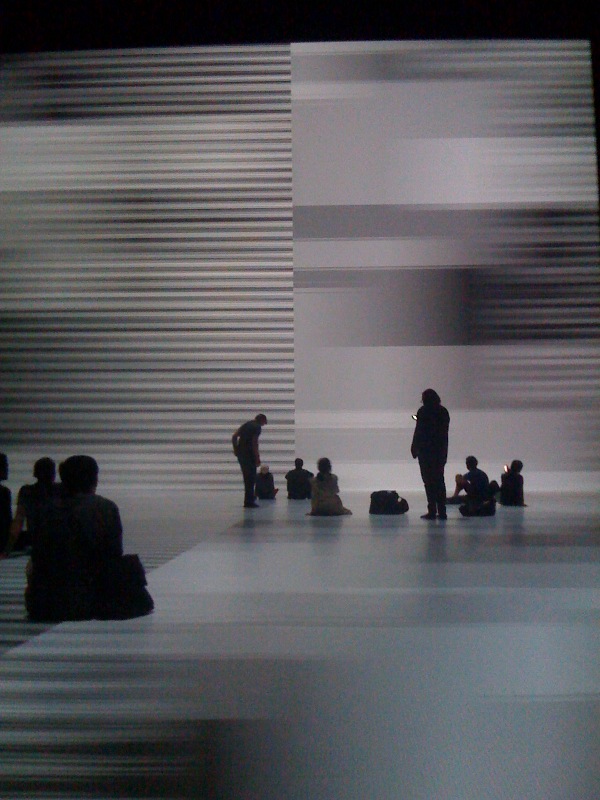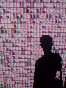 Here you are (that’s me in the picture taking a picture of me), the listener/viewer projected right into Ikeda’s datasphere, a mind in the machine watching those data streams rain over you–a storm of abstract information coming too fast to ever make sense of. If there’s a better image for representing the immersive experience of living in the hyper connected, Facebook-ed, text messaging, Twitterific time of ours, I can’t think of one.