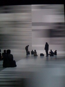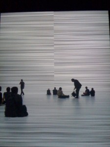 So what does the transfinite mean? In his artist statement, Ikeda notes that the transfinite is “the infinite that is qualitative and ordered” and that the subject of his piece is “the invisible multi substance of data.” While I don’t know exactly how Ikeda and his computer graphics programmers assembled their materials (there are apparently numerous computers working to power this piece), on the level of data the transfinite seems to be about the beauty of mathematics, about how strings of numbers can be re-purposed as artistic work. In this regard, Ikeda has created something powerful and affecting through what would seem to be rather impersonal and austerely rigid means.