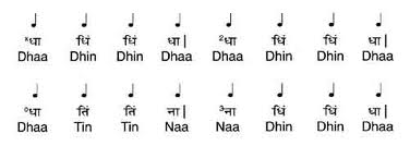 Here’s a representation of how an Indian tabla drummer would play the basic teental rhythmic cycle, with the individual drum strokes (bols) written beneath the musical notation. Notice how the drum strokes change slightly in that third grouping of four beats beginning on beat ten (the open and boomy “Dhin” stroke changing to a thinner sounding “Tin” stroke) to make that vibhaag sound more empty: