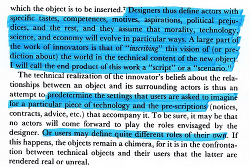 Moreover, what is in the state of electronic music technology–computers, software, hardware–is constantly evolving, pushing musicians one way or another. In her article “The De-Scription of Technical Objects”, Madeleine Akrich argues that technical objects have “scripts” or possible “scenarios” inscribed into them by their designers who “attempt to predetermine the settings that users are asked to imagine for a particular piece of technology…” At the same time though, users “may define quite different roles of their own” in their quest for finding new ways of working not intended by the technology’s designers (Shaping Technology/Building Society, MIT Press, 1992, p.208).