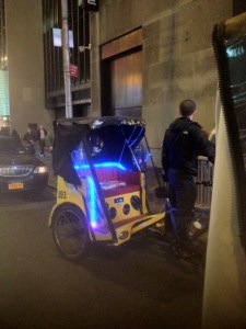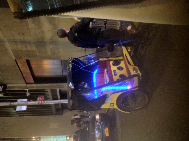 In my experience the best time to write about something is the moment you notice that you’ve been noticing it. Take for example those ever proliferating rickshaw/bicycle taxis in that congregate outside Broadway theaters in Times Square awaiting tourists actually crazy enough pay money for a ride in them. Predator-like, one way the rickshaw drivers attract your attention–besides seizing on even your briefest glance in their direction–is to pimp out their rides with cushioned seats, colored lights, and, most importantly, booming music courtesy of giant bass bins installed beneath the seat. Music: the great sonic seducer.