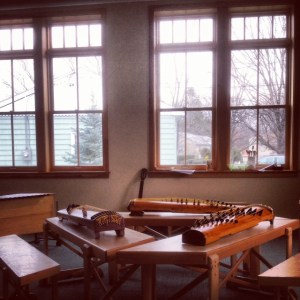 After lunch we headed over to Fred’s other job–teaching music to children at a Montessori elementary school. Fred’s classroom at the school is pretty scenic, its large windows opening out onto the school’s tree-filled yard. Today Fred would be teaching second and third graders and I would be watching. One of the tenets of Montessori education (founded in the early 20th-century by the Italian physician and educator Maria Montessori) is that children and young adults are given opportunities to develop a sense of self through meaningful sensory interaction with their environments. With this in mind I suspected that Fred would use his classroom to create some kind of environment for the second and third graders to explore, though I really had no idea what he was going to do.