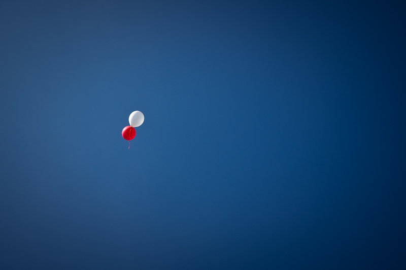 I keep looking up, straining, but lose track of them. There’s still no musical soundtrack, and the red, yellow, and white balloons are now gone.