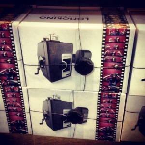Urban Outfitters also sells vintage-style technology. By the front door of the store I spotted the Lomokino 35mm movie camera, a new machine designed to look and function like the 35mm cameras of old. Who, you ask, would use this when we have cell phones that ably do the job? I don’t know, but here it is:
