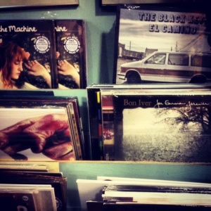 One album that I recognized on the rack because I listened to it a few years ago was Bon Iver’s For Emma, Forever Ago (2007) (see lower right hand corner in photo).