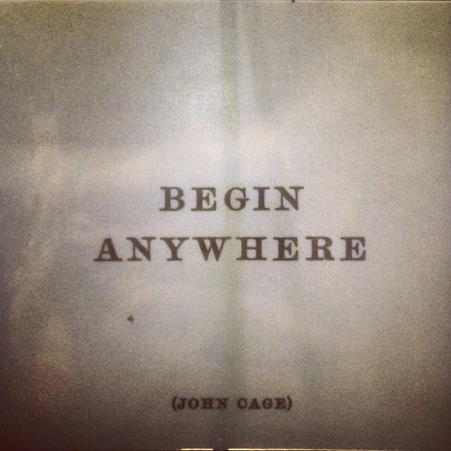A quick and perhaps unreliable Internet search reveals that Cage might have meant his words as advice for those facing the psychological paralysis brought about by not knowing where to begin their project, their work, their book, their art. Perhaps–and now that I think of it, Internet searches themselves can often be exactly like this as well–the problem is having too many options, too many links, which brings about a flawed question to oneself: Where’s the best place to begin (my search, my project, etc.)?