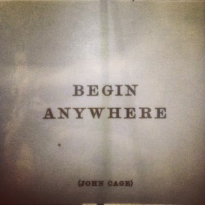 Finally, something else comes to mind when I think about that inspirational magnet. Begin anywhere, certainly, but once begun with whatever it is that you’re doing, be deliberate about your going. Cage walked the walk of his talk in this respect too. Whatever methods he used to help him make musical decisions, once he set up the system, so to speak, he rigorously adhered to it, letting it take him and his compositions somewhere (and these somewheres didn’t always make for engaging listening either). In other words, it takes a great discipline to grant oneself the freedom to begin anywhere and then let that anywhere run its course.