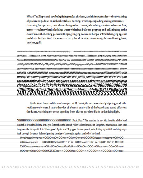 But this is a small shortcoming. If you stick with Sounds, the reading gets quicker and the density of Wolf’s polyphonic dialogue begins to sing. I appreciated, for instance, how the different typeface styles and sizes he uses convey what the ear would easily hear without needing an explanation. Case in point: one bit of whispered talk is rendered in a microscopic font and the effect–helped by how easily our eyes can interpret physical smallness as acoustic quietness–is more affective than simply telling us that a character has just whispered something. In other places, Wolf tries other tactics: he includes a list of few dozen search terms from Cincy’s Internet search free-floating without a musical stave for support which makes them stand out in an unusual, clinical way (260); he depicts a flurry of memories as short phrases written slightly crooked over a huge, 21-line stave (247); he shows the noise of a character’s conflicting thoughts by superimposing layer upon layer of word streams to the point of being unreadable (343); and near the end of the book, he graphically represents the sound of a house party’s booming sound system through large grey blocks that look like maxed out sound waves (304-312). If there is a meta-theme throughout Sound, it’s that coherent meaning is always on the verge of getting fuzzy, always on the verge of being swallowed by noise.