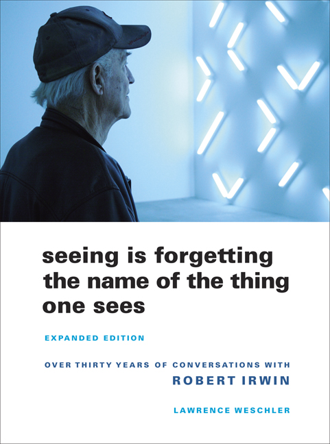 At the heart of Seeing Is Forgetting the Name Of the Thing One Sees (1982/2009), Lawrence Weschler’s biography of the artist Robert Irwin, are two intertwined and reoccurring ideas: presence and perception. Irwin (1928-), an American conceptual/installation artist, began his art career in the 1950s with paintings of lines and dots, then, in the 1960s, moved to painting round aluminum discs. By the 1970s he had gone beyond what he felt were the arbitrary edges of canvas and art object to take on the museum spaces themselves as the subject matter of his installation art. Since the 1980s, Irwin has worked on permanent outdoor installations intended to enhance their environments. In the process, his work has become ever less material, and increasingly concerned with getting us to experience a perceptual state in which we notice ourselves noticing.