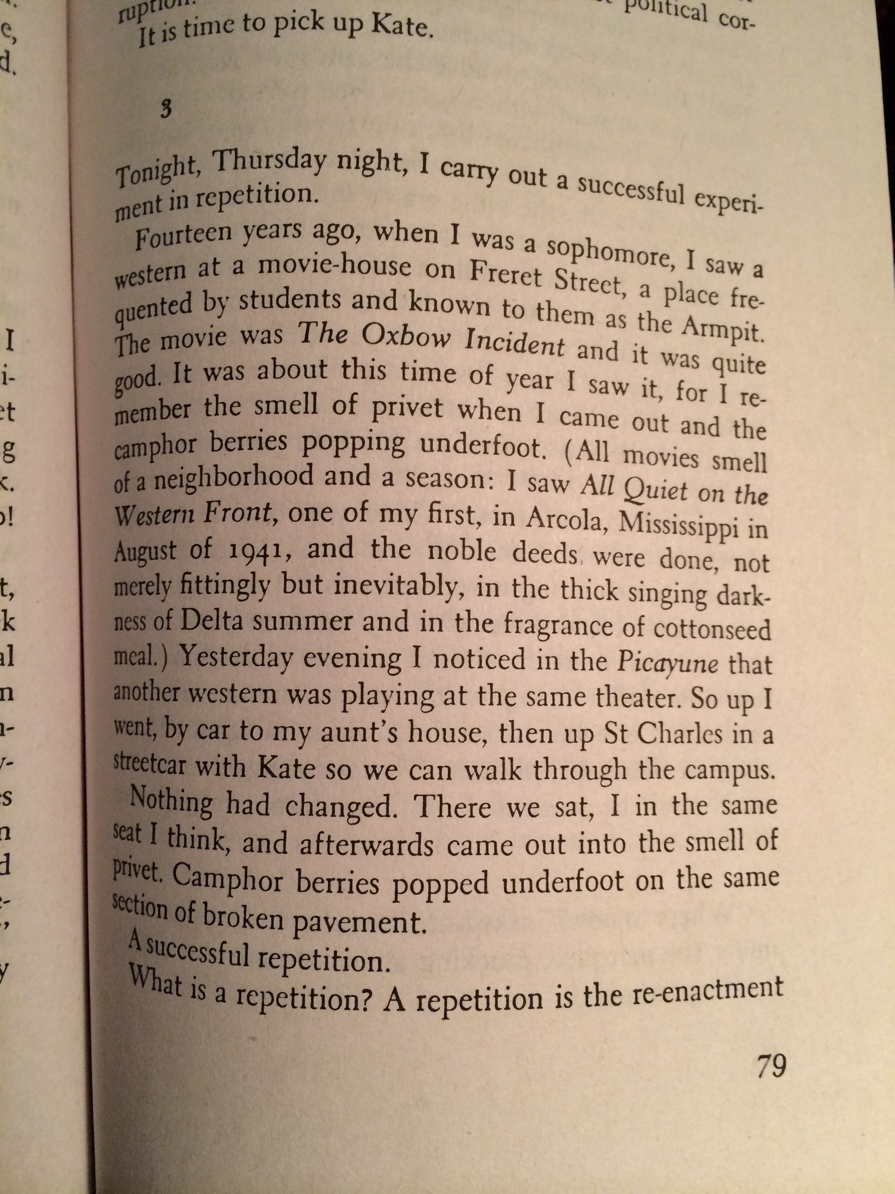 “What is a repetition? A repetition is the re-enactment of past experience toward the end of isolating the time segment which has lapsed in order that it, the lapsed time, can be savored of itself without the usual adulteration of events that clog time like peanuts in brittle.”