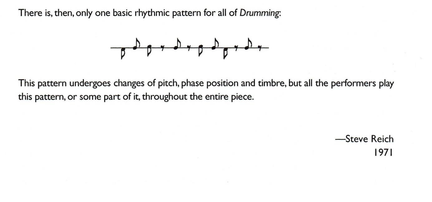 Every once in a while warming up before a show I noodle around by playing a bit of Steve Reich’s Drumming on the marimba. Composed in 1971, Drumming is over an hour of continuous percussion music entirely built on just a few pitches arranged in a constellation of eight beats over twelve pulses. This is the core melo-rhythmic pattern: