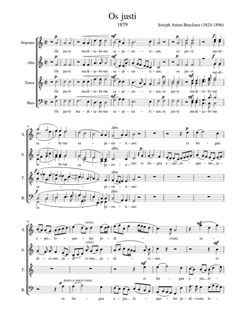 (Based on a Gregorian chant, Bruckner’s motet is 69 measures long and in the Lydian mode. Below are the first 24 measures.)