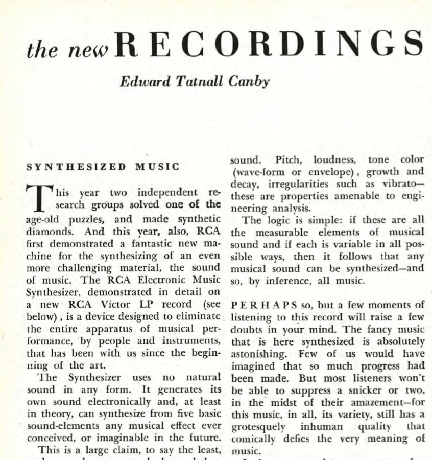 – Edward Tatnall Canby, “Synthesized Music”, Harper’s (September 1955)