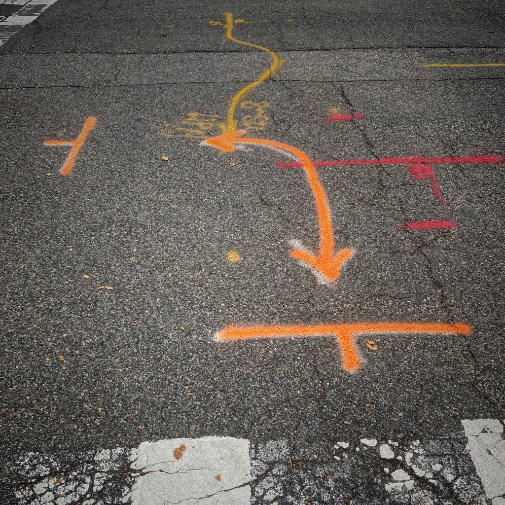 While running recently I came across some construction spray painted markings on the road that got me thinking about the relationship between intuitions and conventions in artistic practice. I stopped at the edge of the road—I often look for reasons to interrupt a run—and studied the fluorescent markings. I saw a curved line with arrows on each end facing straight lines. I imagined the curved line as representing the intuitive practice that underlies craft, and its arrows pointing in varied directions conveying a sense of open-ended exploration. The two straight lines represented the borders, boundaries, and constraints of conventions. I read the markings like this: the curved lines of practice are hemmed in by the straight lines of convention. I took a few photos and resumed running.