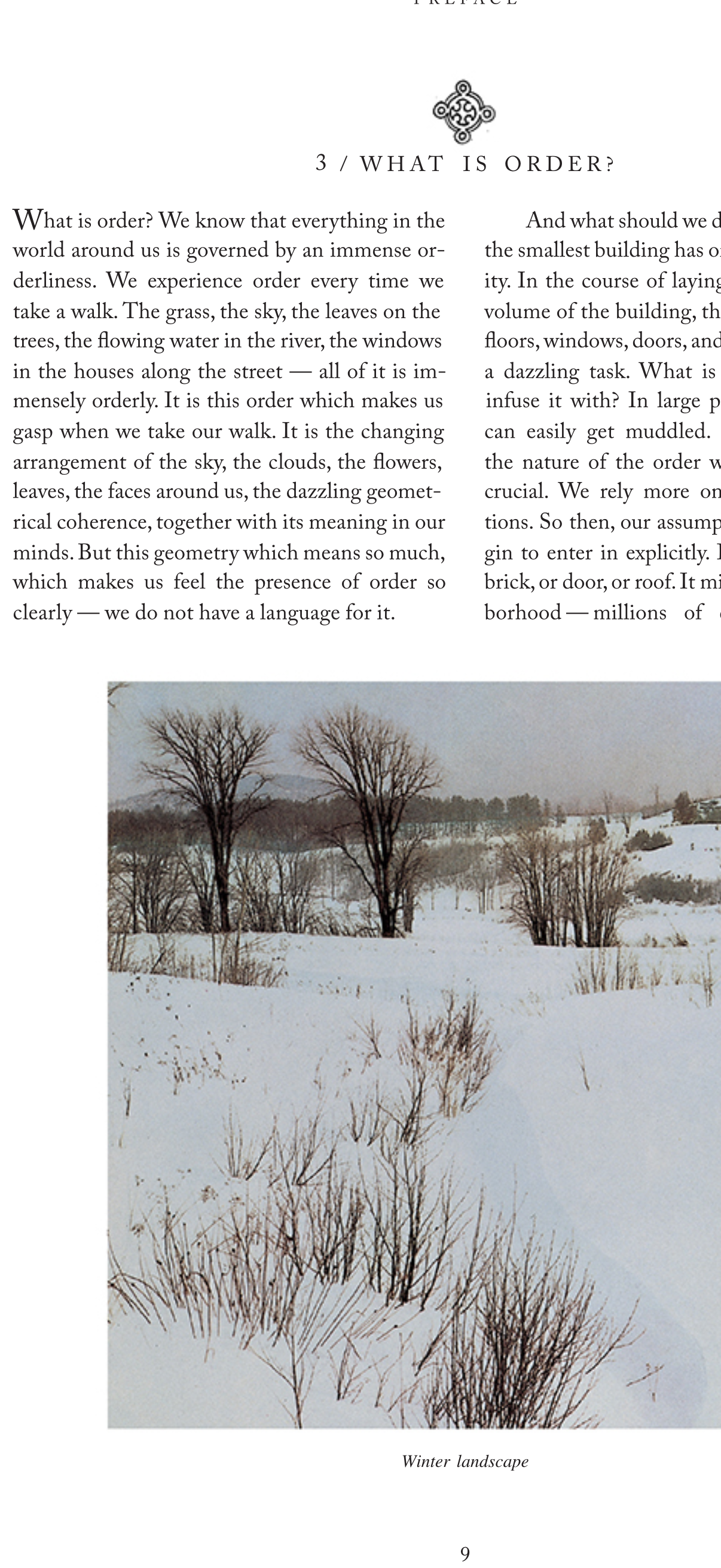 “What is order? We know that everything in the world around us is covered by an immense orderliness. We experience order every time we take a walk. The grass, the sky, the leaves on the trees, the flowing water in the river, the windows in the houses along the street–all of it is immensely orderly. It is this order which makes us gasp when we take our walk. It is the changing arrangement of the sky, the clouds, the flowers, leaves, the faces around us, the dazzling geometrical coherence, together with its meanings in our minds. But this geometry which means so much, which makes us feel the presence or order so clearly–we do not have a language for it.”